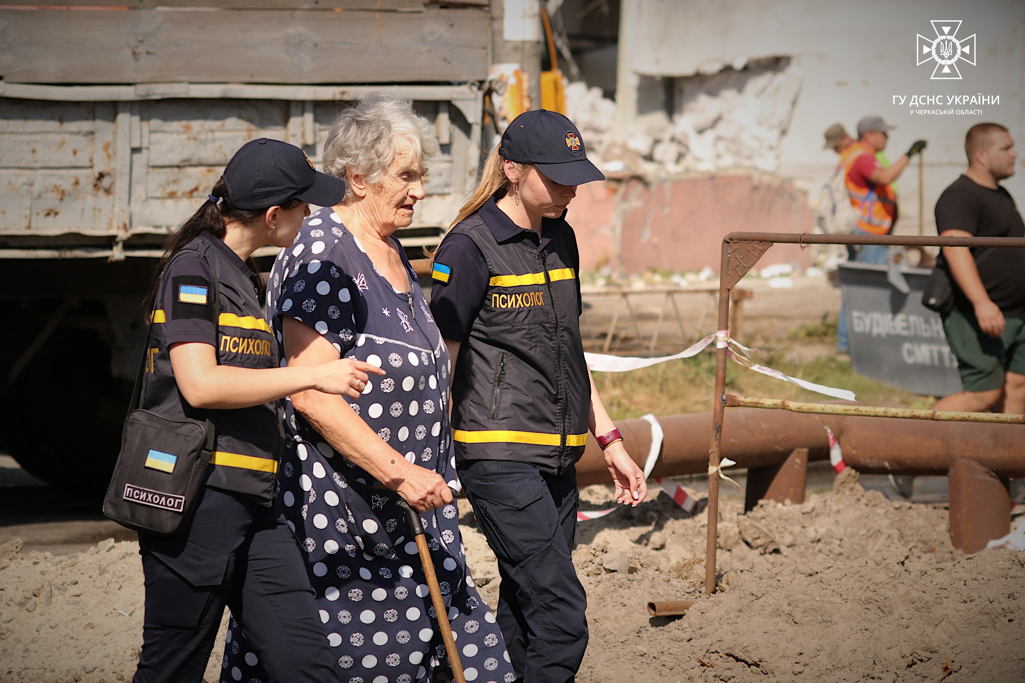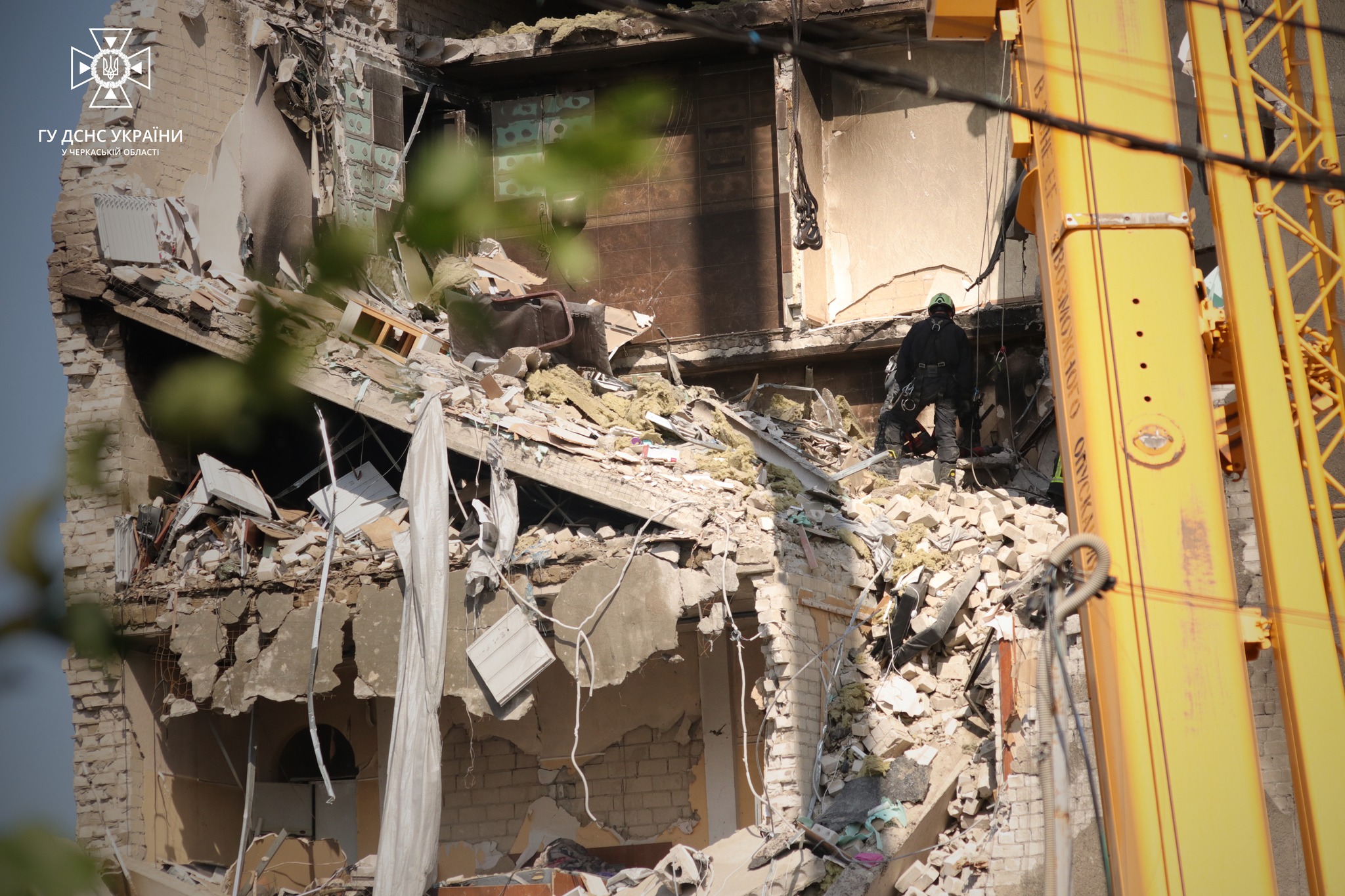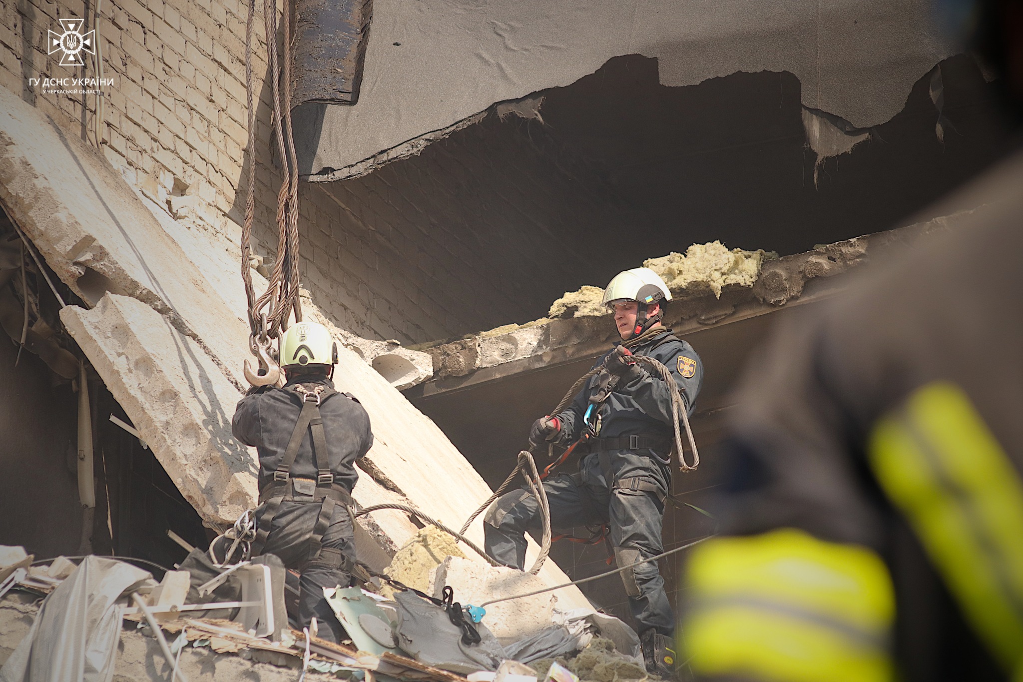 Триває розбір завалів на місці ворожого удару у центрі міста Черкаси. Працюють надзвичайники. Повідомляє Обласне управління ДСНС.