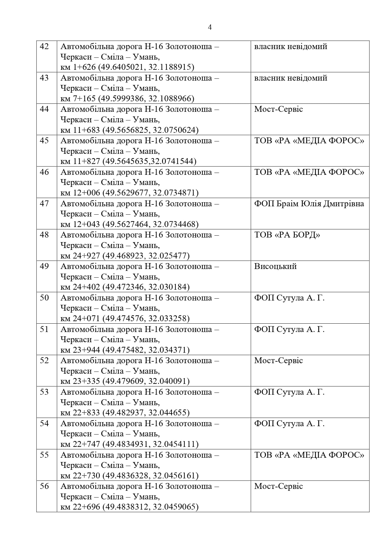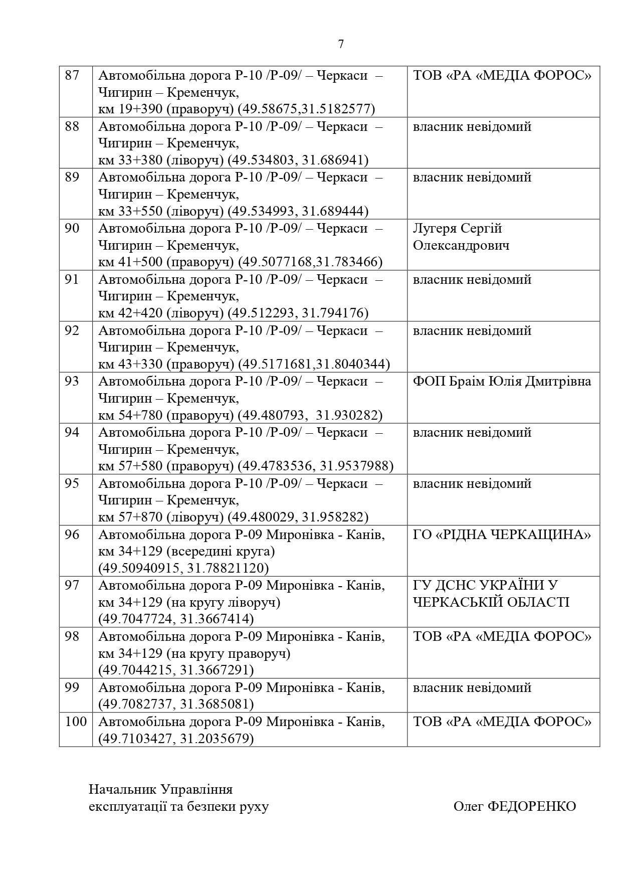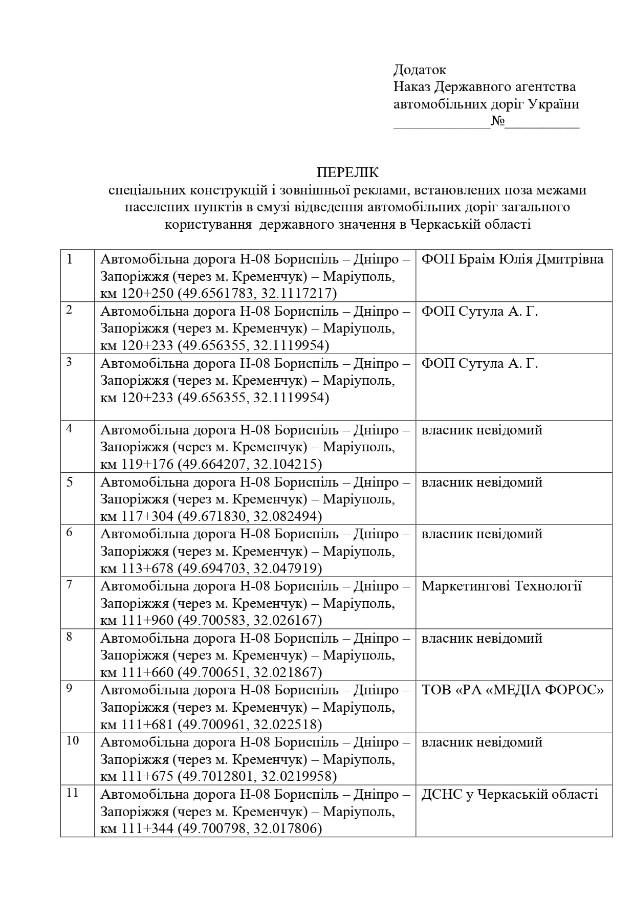 Самовільно встановлені рекламні конструкції виявлено на автодорогах Н-08 Бориспіль – Дніпро – Запоріжжя – Маріуполь (37 шт.), Н-16 Золотоноша – Черкаси – Сміла – Умань (40 шт.), Р-10 /Р-09/ – Черкаси – Чигирин – Кременчук (18 шт.) та Р-09 Миронівка – Канів (5 шт.).
