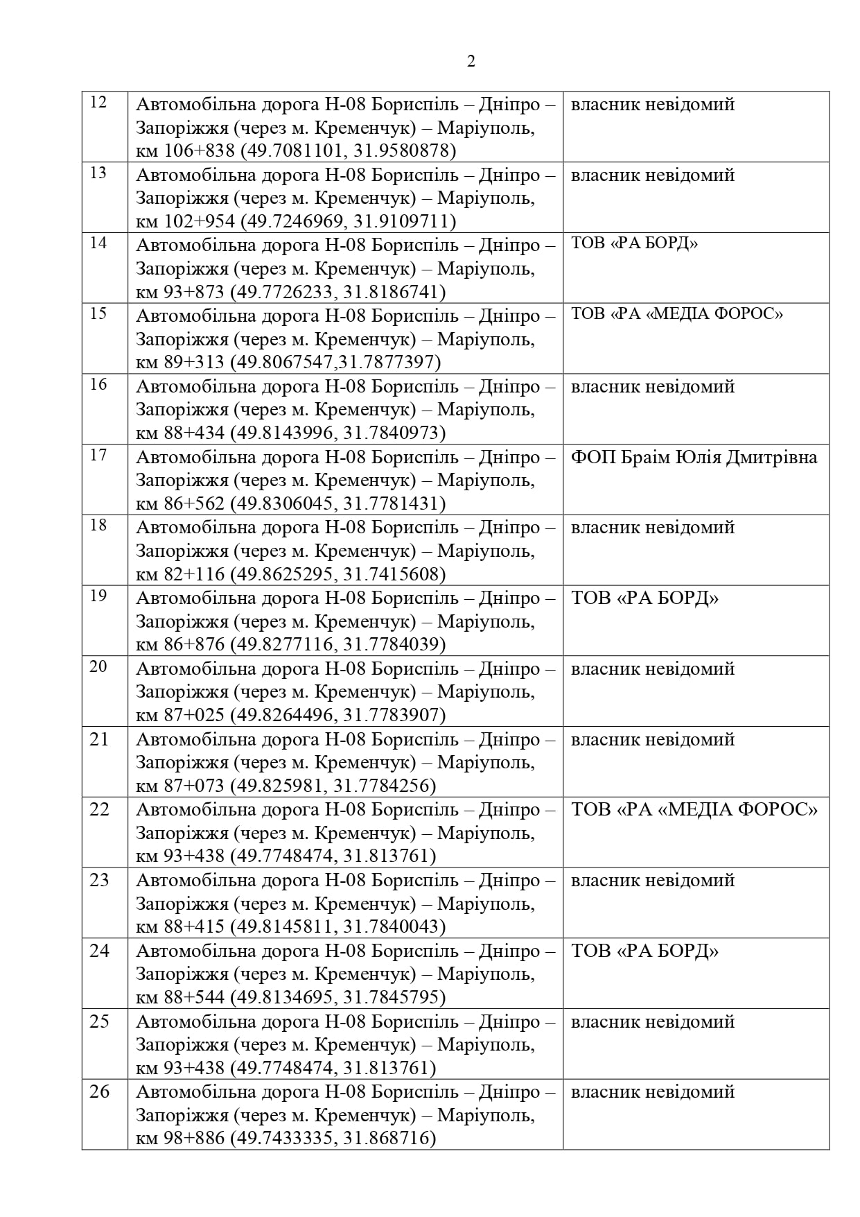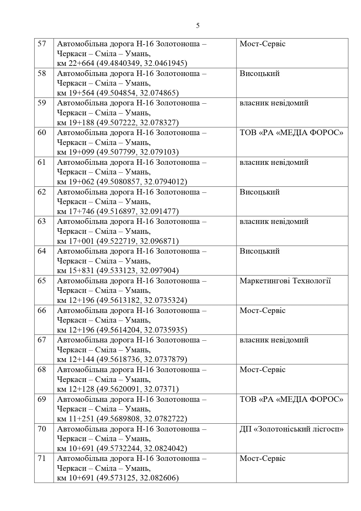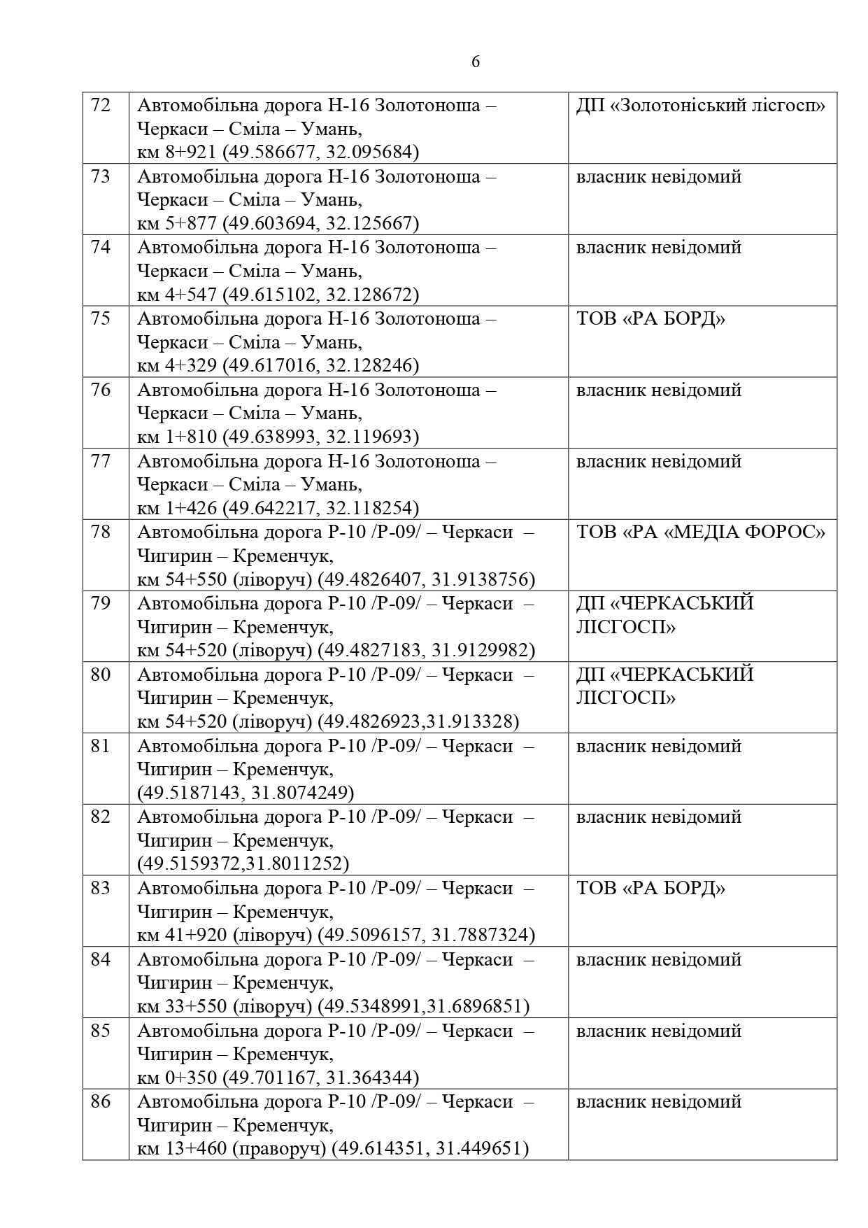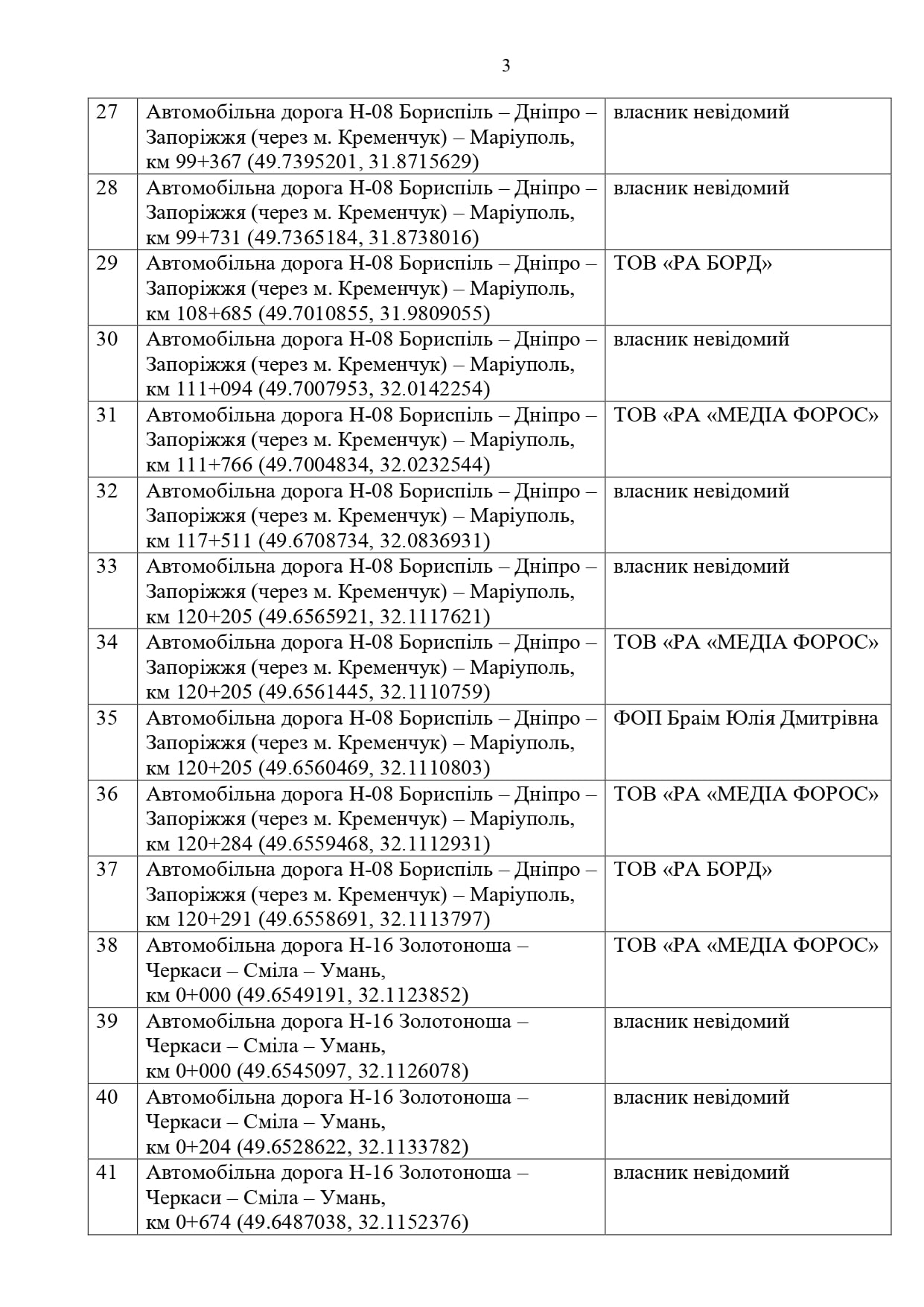 Самовільно встановлені рекламні конструкції виявлено на автодорогах Н-08 Бориспіль – Дніпро – Запоріжжя – Маріуполь (37 шт.), Н-16 Золотоноша – Черкаси – Сміла – Умань (40 шт.), Р-10 /Р-09/ – Черкаси – Чигирин – Кременчук (18 шт.) та Р-09 Миронівка – Канів (5 шт.).