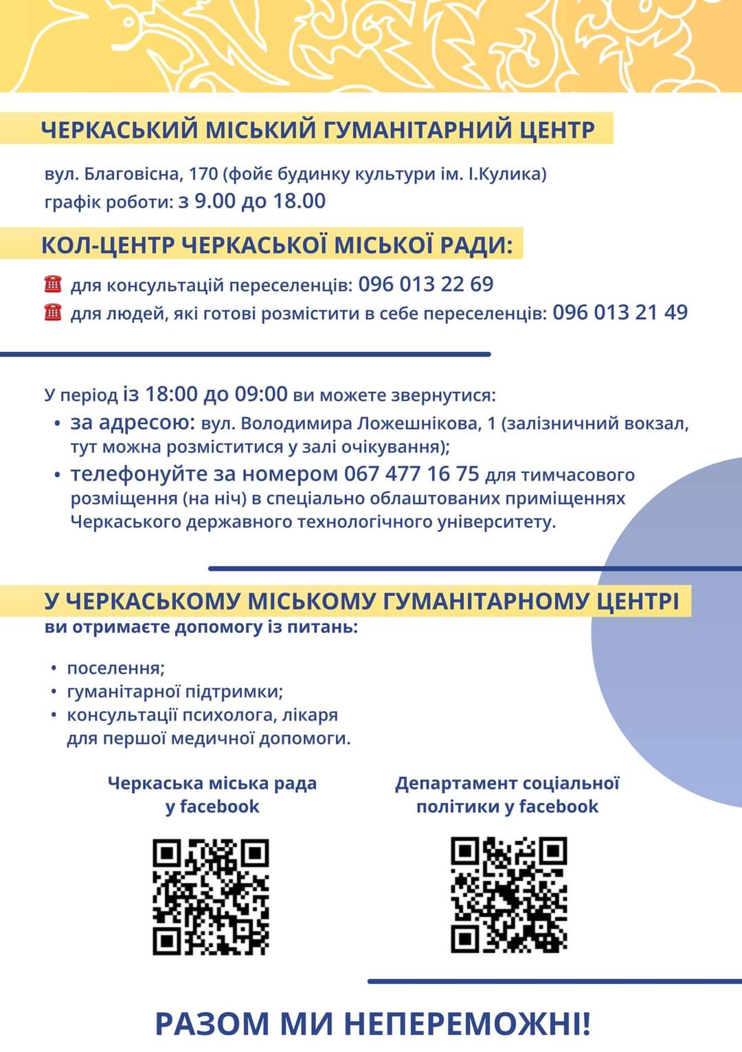 Центр гуманітарної допомоги розташований за адресою: вул. Благовісна 170 (Черкаський міський Будинок культури ім. І.Кулика).