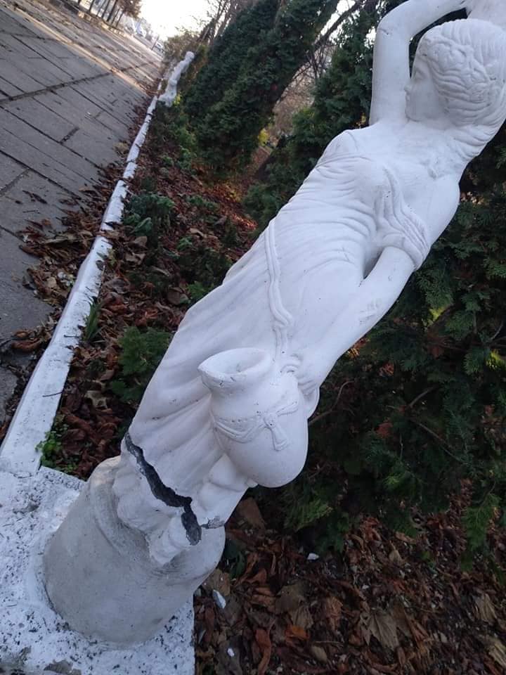 «Попрацювали» вандали у самому центрі міста. Окрім розбитих вікон у будинку культури зловмисники знищили лавку для відпочинку та скульптуру, які знаходяться на території міського парку.