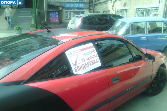 У центрі міста спостерігачі ОПОРИ помітили, як активісти від кандидата в мери Черкас Анатолія Бондаренка роздавали водіям наклейки на скло автомобіля з написом "Я голосую за Бондаренка".