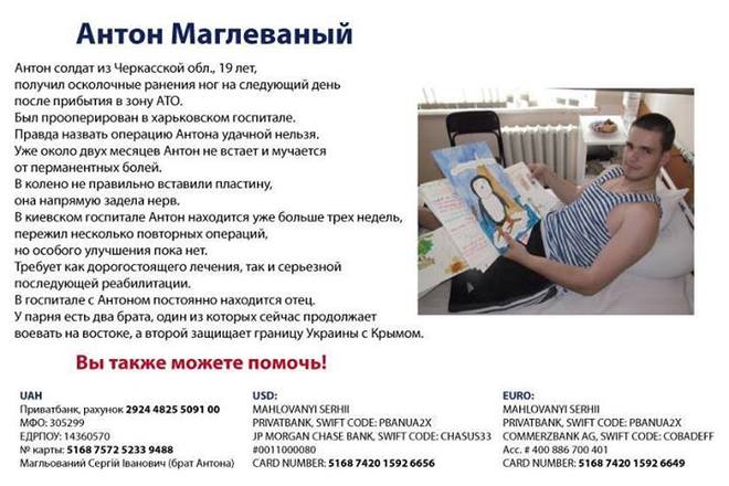 Черкащанин Антон Магльований отримав осколкові поранення ніг на наступний день після прибуття в зону АТО. Його прооперували в харківському госпіталі. Щоправда назвати операцію Антона вдалою неможна – близько двох місяців він не встає і мучиться від болю, повідомляє у Facebook Волонтерська Сотня.