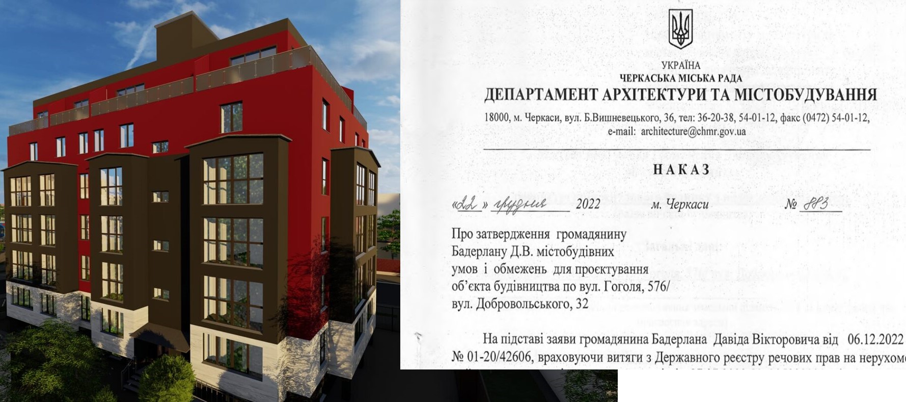 Як розповідав раніше сайт vikka.ua, на розі вулиць Добровольського та Гоголя, що в Черкасах, Давід Бадерлан викупив приватний будинок. Він вирішив збудувати малоповерховий будинок. З відповідним клопотанням про надання містобудівних умов та обмежень Бадерлан звернувся до міської влади. Наприкінці серпня минулого року йому дозволили провести реконструкцію приватного будинку.