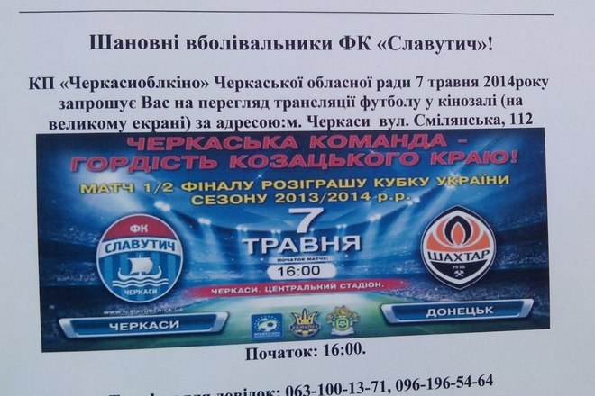 7 травня о 16.00 КП "Черкасиоблкіно" Черкаської обласної ради запрошує вболівальників ФК "Славутич" дивитися трансляцію 1/2 Кубку Фіналу України у кінозалі на великому екрані.