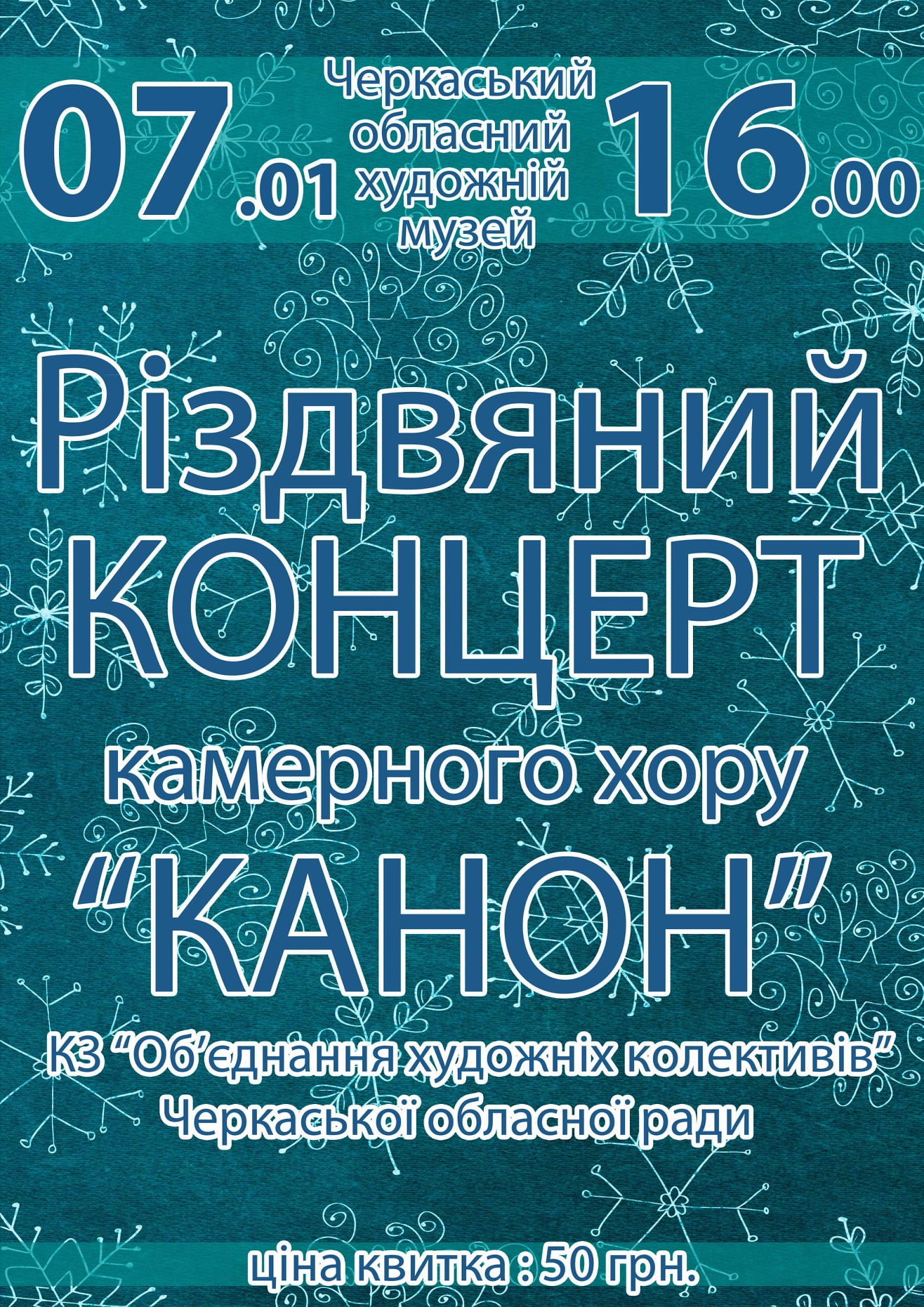 Так, вже найближчого четверга, на Різдво у Черкаському обласному художньому музеї відбудеться Різдвяний концерт камерного хору «Канон» комунального закладу «Об’єднання художніх колективів» Черкаської облради.