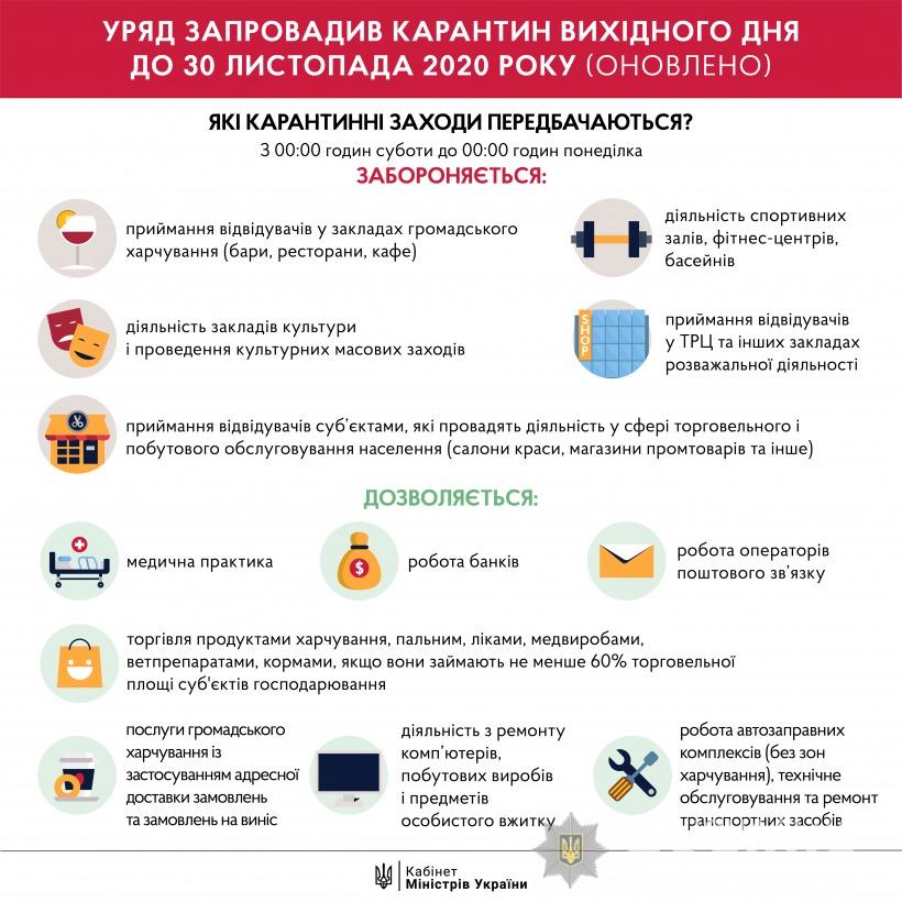 Починаючи з 00:00 годин суботи до 00:00 годин понеділка на всій території України забороняється робота всіх закладів культури (театри, кінотеатри), басейнів, спортивних залів, фітнес-центрів і торгово-розважальних центрів. Барам, ресторанам та кафе також заборонено приймати відвідувачів, вони можуть працювати в режимі «на виніс» або здійснюючи адресну доставку.