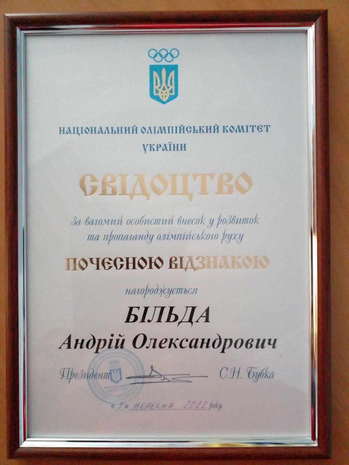 Національний олімпійський комітет України відзначив голову відділення НОК України в Черкаській області, який нині став на захист України, Андрія Більду. Про це повідомляють у Відділенні НОК України в Черкаській області.