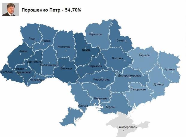 Як свідчать результати виборів, майже всі центральні і західні регіони віддали за Петра Порошенка більше 50 % голосів.