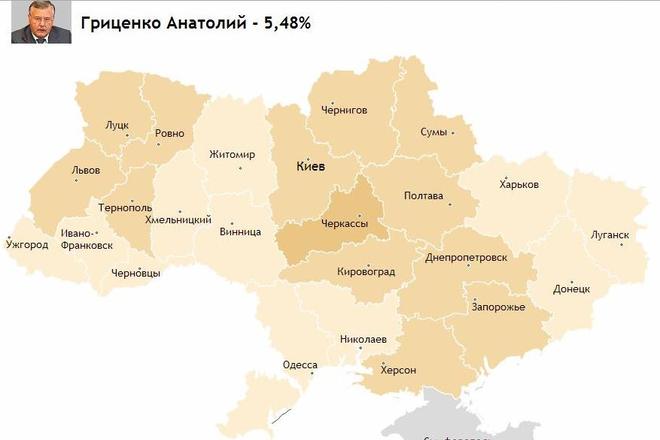 Анатолій Гриценко, що народився на Черкащині, здобув на своїй рідній землі 9,04 %. Такий результат є найбільший в порівняні з іншими регіонами.