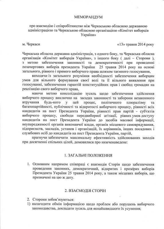 За десять днів українці обиратимуть президента країни на наступні 5 років. Одночасно з цим 25 травня у низці районів Черкаської області відбудуться позачергові вибори сільських та міських голів. Тож для того, аби вони пройшли максимально чесно й прозоро, Черкаська ОДА та обласна організація "Комітет виборців України" підписали меморандум про взаємодію і співпрацю.