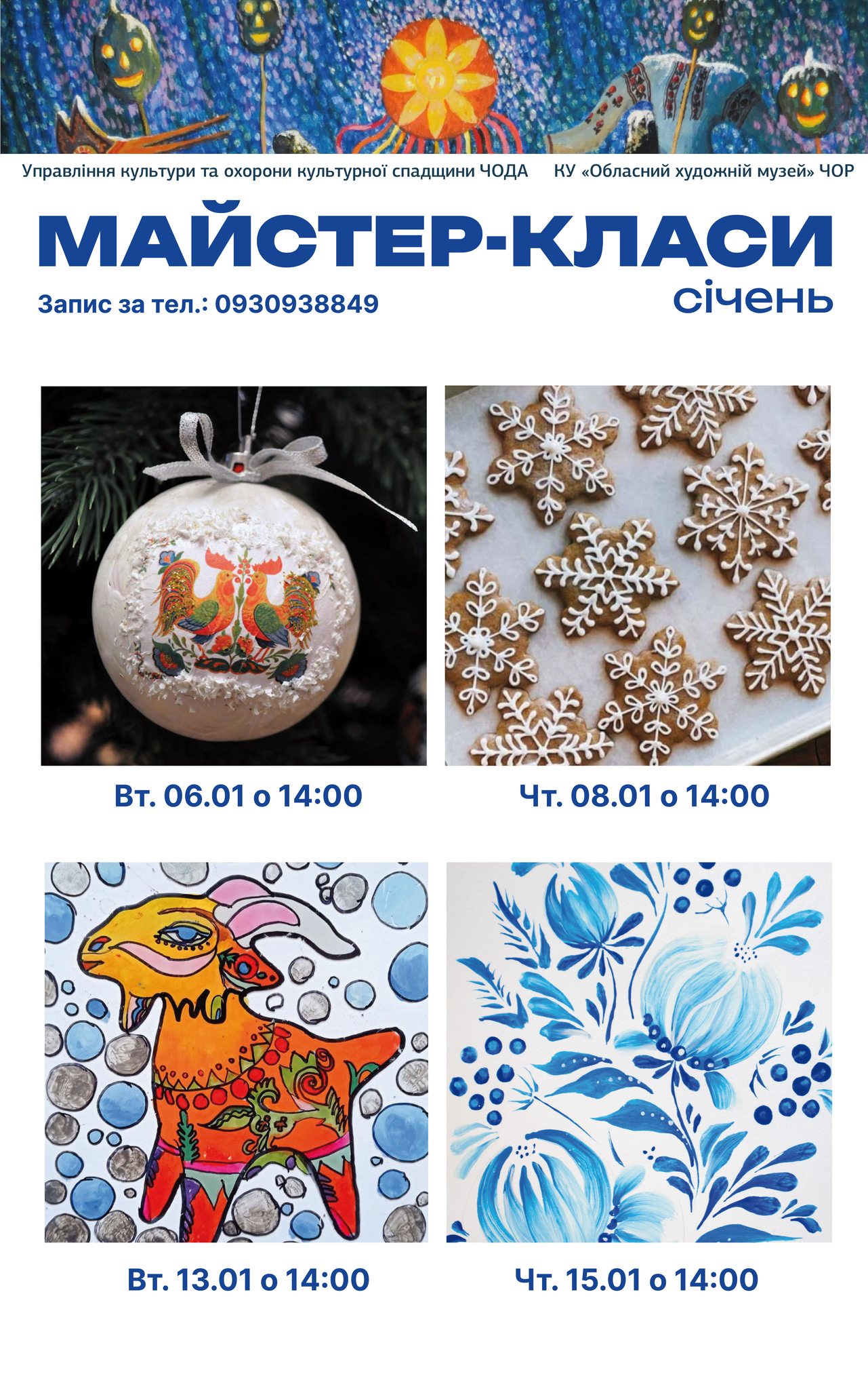 Січнева програма майстер-класів різноманітна й розрахована на різний вік та інтереси. Учасники зможуть власноруч створити ялинкові прикраси в техніці декупажу, розписати ароматні пряники, спробувати малювання на склі з казковими мотивами та опанувати елементи петриківського розпису, створивши святкову листівку.
