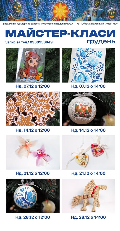 У грудні Черкаський художній музей перетвориться на творчу майстерню, де щонеділі пануватиме атмосфера тепла, натхнення та передсвяткових чар — майстер-класи. Тут дорослі й діти зможуть зануритися у світ мистецтва та власноруч створити новорічні вироби, які прикрасять дім або стануть особливим подарунком.