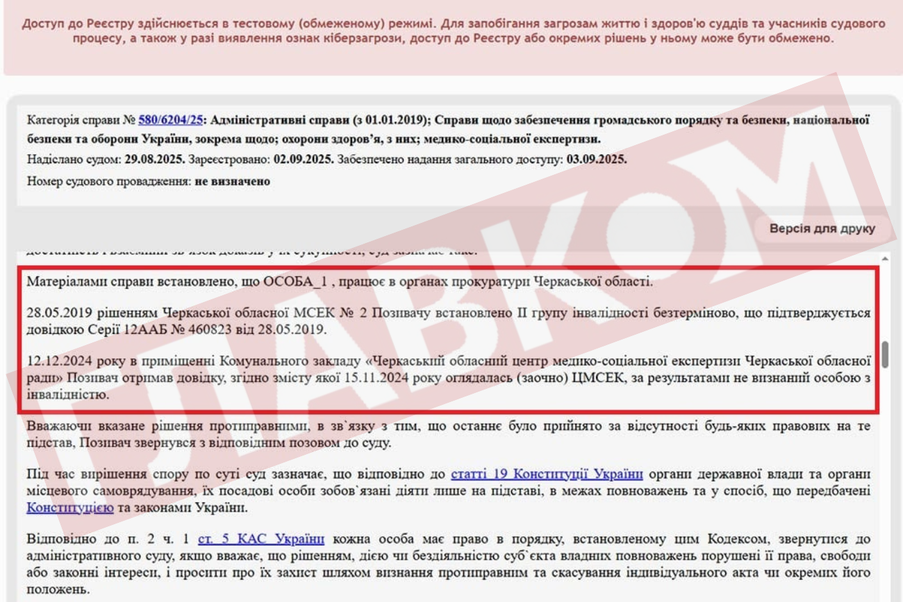 Прокурор Черкаської окружної прокуратури Володимир Горідько через суд скасував вердикт Інституту МОЗ. Цей інститут піддав сумніву групу інвалідності працівника прокуратури. Про це розповідає сайт «Главком».