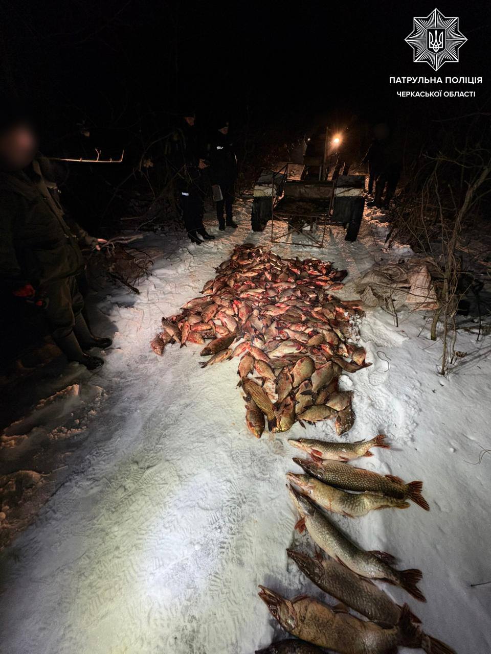 Оглянувши трицикл, поліцейські виявили рибальський бур та 5 мішків зі свіжовиловленою рибою видів: лящ — 155 шт., карась — 57 шт., короп — 14 шт., щука — 9 шт., товстолоб — 11 шт., плітка — 2 шт., плоскирка — 1 шт. Сума збитків завдана державі становить понад 2 мільйони гривень.