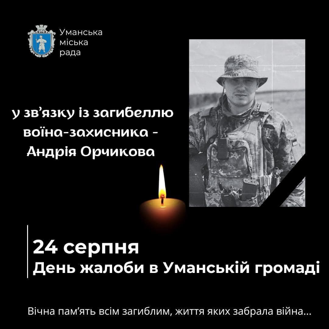 24 серпня громада міста Умань оголосила День жалоби у зв’язку із загибеллю воїна-захисника – Андрія Орчикова. Про це повідомляють в Уманському виконкомі.