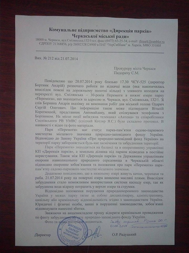 Як стверджують у КП, увечері, 20 липня, ЧСУ-525 почало ліквідовувати повінь на розі вулиць Смілянської та 30-річчя Перемоги, зливаючи воду з дорожнього полотна в нижнє озеро парку. На місце події викликали правоохоронців.