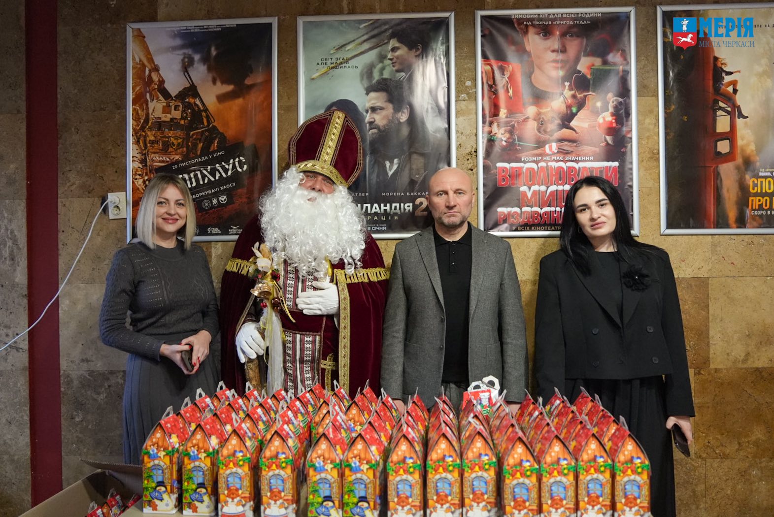 У кінотеатрі «Україна» для них підготували різдвяну атмосферу: перегляд мультфільму, зустріч зі Святим Миколаєм, солодкі подарунки, фотозони.