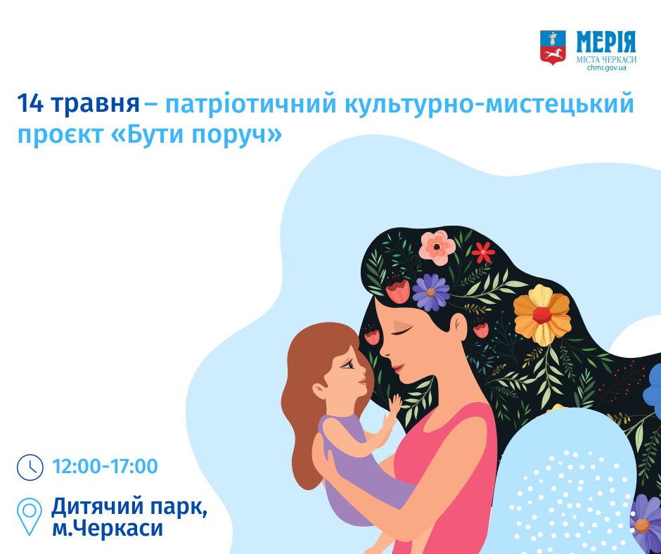 Патріотичні майстер-класи, виставки світлин і малюнків, арттерапія та інтерактивні події для дітей – у Черкасах проведуть патріотичний культурно-мистецький проєкт «Бути поруч». Він відбудеться 14 травня в Дитячому парку. Захід приурочили до Дня матері та Міжнародного дня сім’ї. Повідомляють на сайті Черкаської міської ради.
