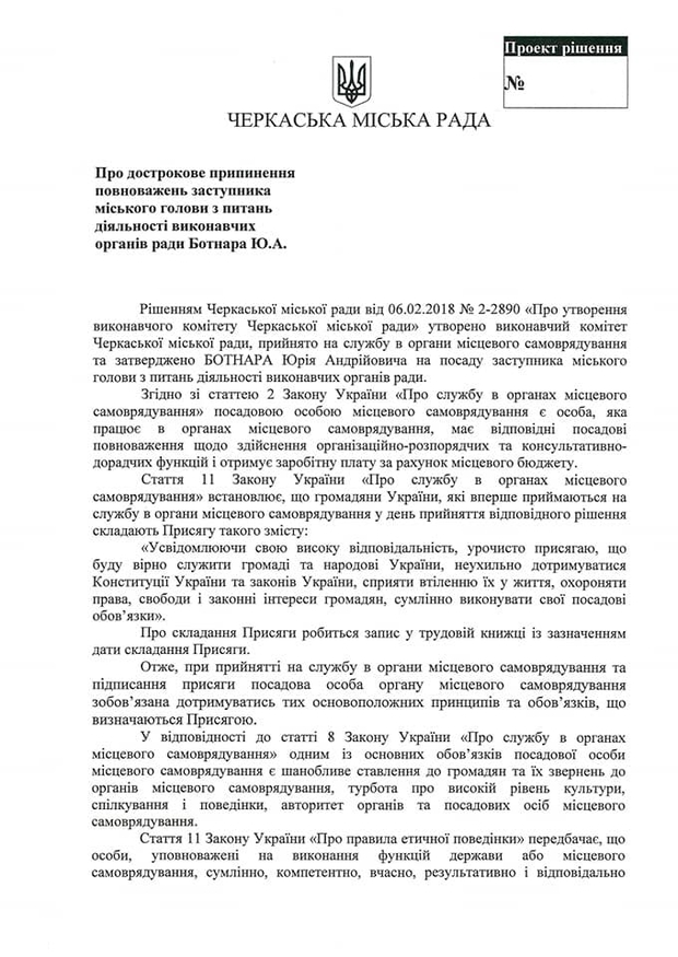 8 травня черкаський депутат Олександр Радуцький зареєстрував проект рішення про дострокове припинення повноважень заступника черкаського мера Юрія Ботнара. Відповідний документ обранець поширив у Facebook.