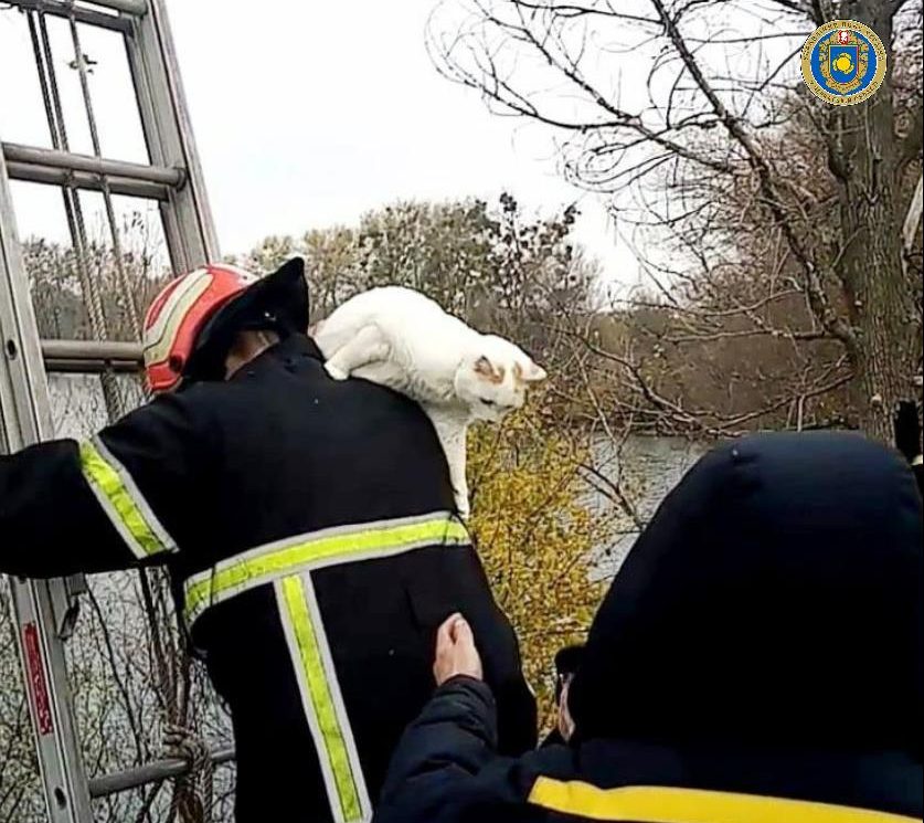 Надзвичайники, які прибули на місце події, за допомогою висувної драбини та мотузки зняли чотирилапого з 8-метрової висоти на землю.