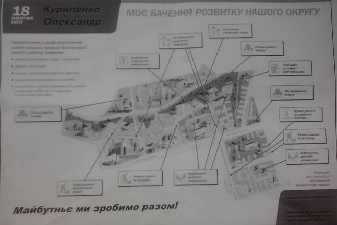 "Це називається "скомуниздив"! Пан Куриленко, кандидат по округу № 18, вирішив не замарачуватися і не писати передвиборних програм. Він просто взяв карту округу іншого кандидата – Оксани Мелікової – замінив її прізвище на свої, поміняв контактні дані, кинув на ксерокс. І опа! Чувак вже знає, де відремонтувати дорогу, де тротуар, а де поставити майданчик", – написав Кузляєв.