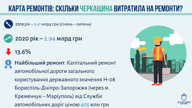 Аналітики Штабу повідомили, що з початку 2020 року на проведення ремонтних робіт у Черкаській області було витрачено 2.94 млрд грн, що на 13.6% менше у порівнянні з минулим роком (3.41 млрд грн за перше півріччя 2019 р.).