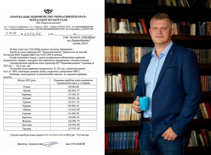 Заробітна плата керівника комунального підприємства «Черкасиводоканал» Івана Сухарькова більша, ніж, скажімо, дохід мера Києва Віталія Кличка. Торік Сухарьков заробив 1,5 млн грн, а міський голова столиці – 1 млн грн. Про рівень зарплатні директора водоканалу Черкас відомо із відповіді на інформаційний запит порталу «OBOZ.UA».