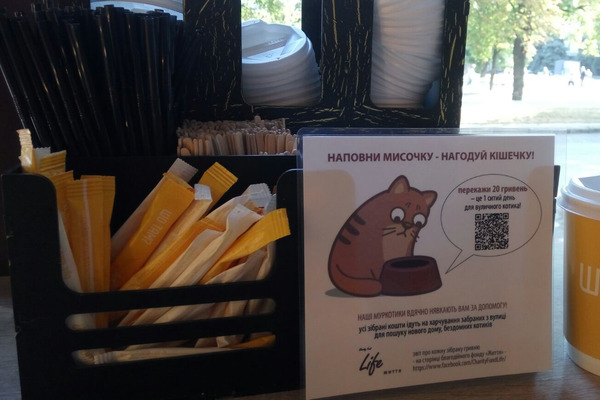 Черкащани, які забажають переказати котикам кошти на обід, отримають на телефон сердечне побажання гарного дня і побачать, як їх внесок допоміг наповнити мисочку котика. Перші такі таблички можна побачити у креативному кафе на вул. Шевченка, 352.