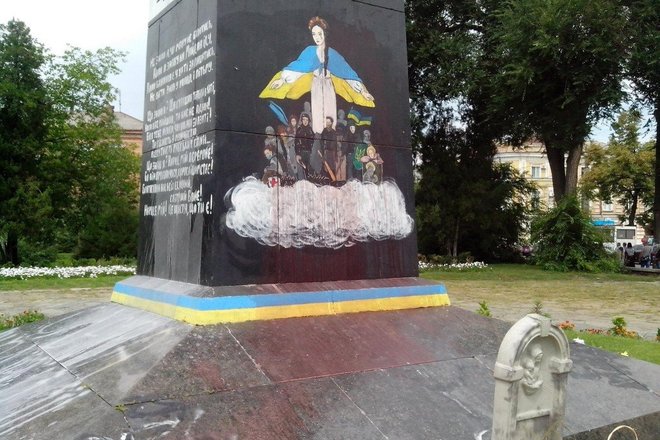 Крім того, у Полтаві червоною фарбою облили намальоване на вшанування пам’яті Небесної сотні графіті. Частину зображення вдалося очистити, але деякі елементи доведеться перемальовувати.