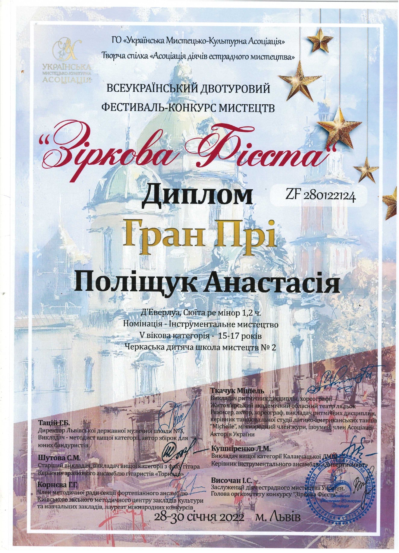 Гран-прі номінації «Інструментальне мистецтво» за гру на віолончелі (вікова категорія – 15–17 років) отримала Анастасія Поліщук. Готувала дівчину викладачка Вікторія Явнанова, концертмейстер – Тетяна Кужман.