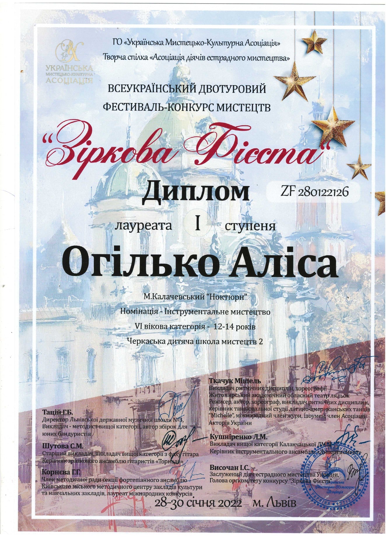 Перше місце в номінації «Інструментальне мистецтво» за гру на фортепіано (вікова категорія – 12–14 років) виборола Аліса Огілько. Викладачка – Тетяна Кужман.