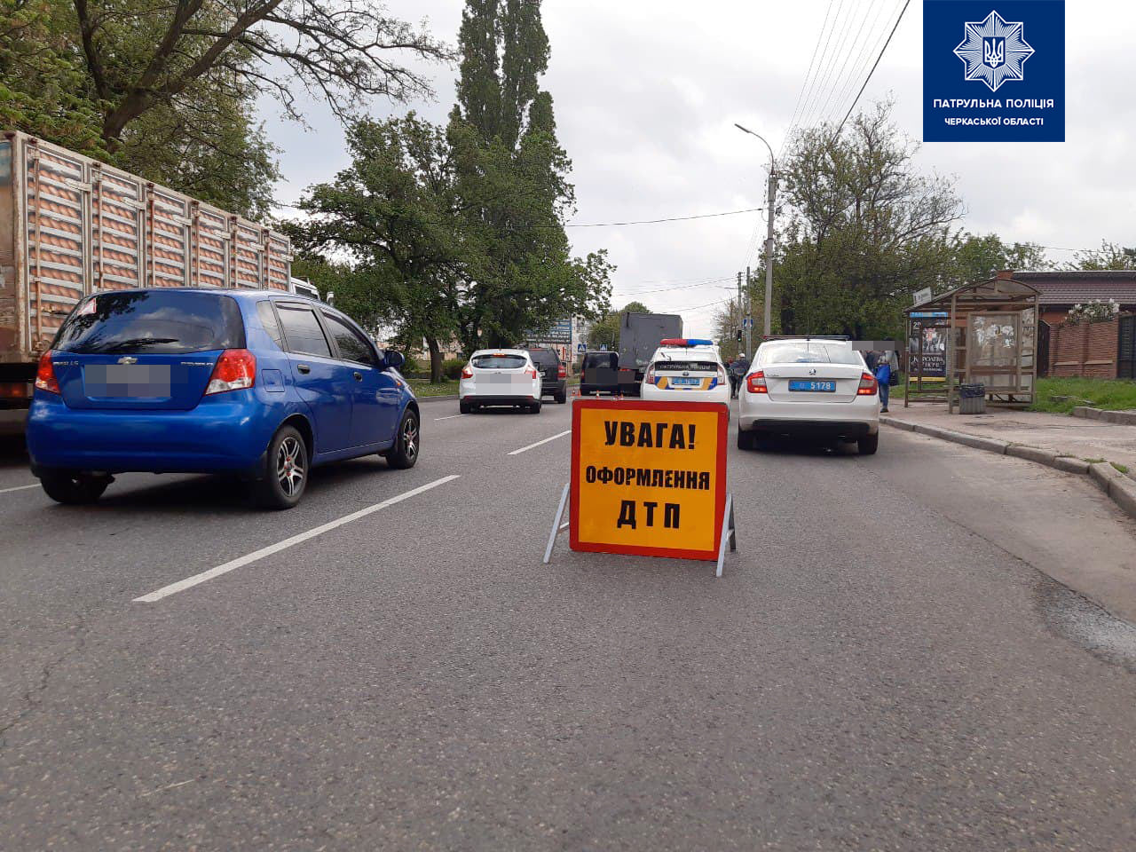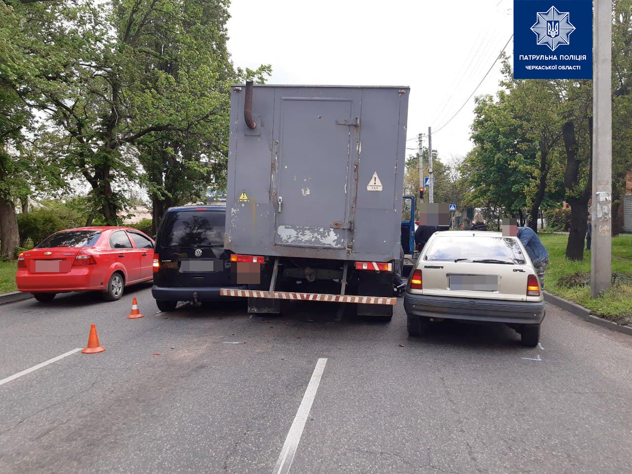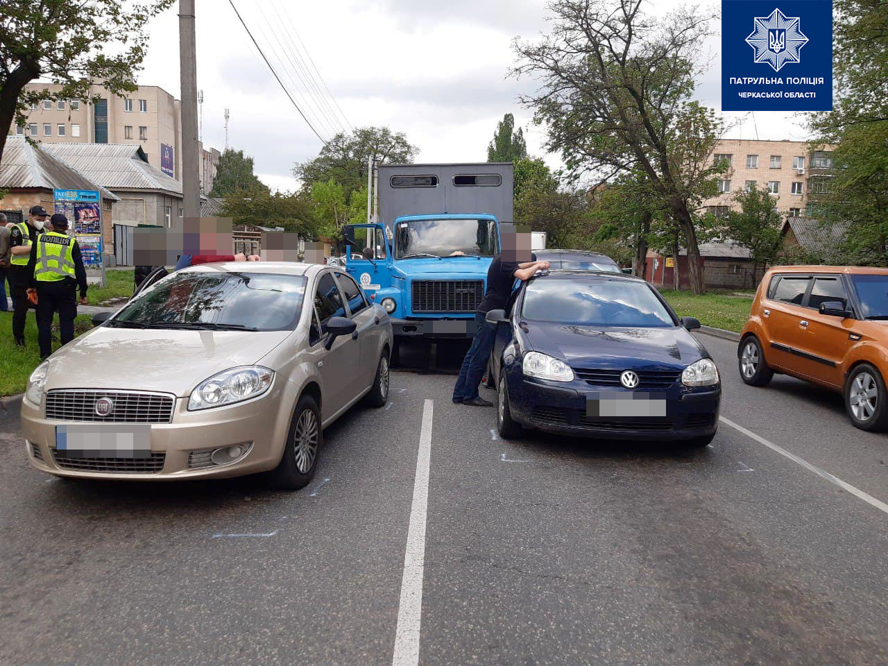 Перша ДТП виникла на перехресті з вулицею Пастерівською. Водій автомобіля ГАЗ 3307 не обрав безпечної швидкості руху, не дотримався безпечної дистанції та скоїв зіткнення з автомобілями Opel Kadett, Fiat Linea, Volkswagen Golf та Volkswagen Caddy. Про це інформує пресслужба УПП у Черкаській області.