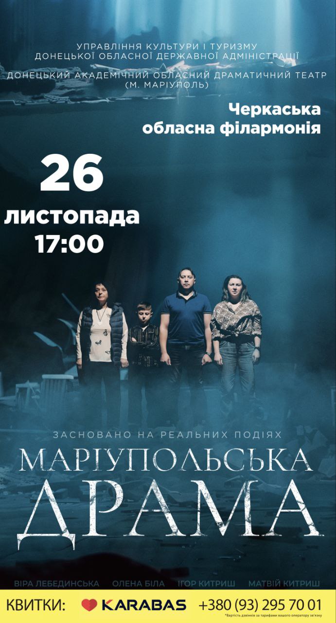 26 листопада у Черкаській обласній філармонії покажуть виставу, яка не просто звертається до болю — вона говорить ним. «Маріупольська драма» — це не театральна інтерпретація, не художній домисел і не творче прочитання подій. Це сторітеллінг, побудований на реальних спогадах людей, які пережили одне з найтяжчих випробувань у сучасній історії України.