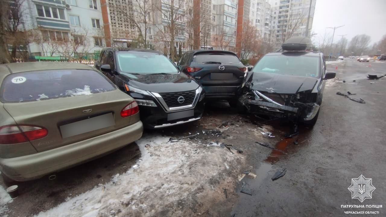У Черкасах на вулиці Героїв Дніпра сталася масова ДТП за участі п’яти автомобілів. Про це повідомляє Патрульна поліція Черкаської області.