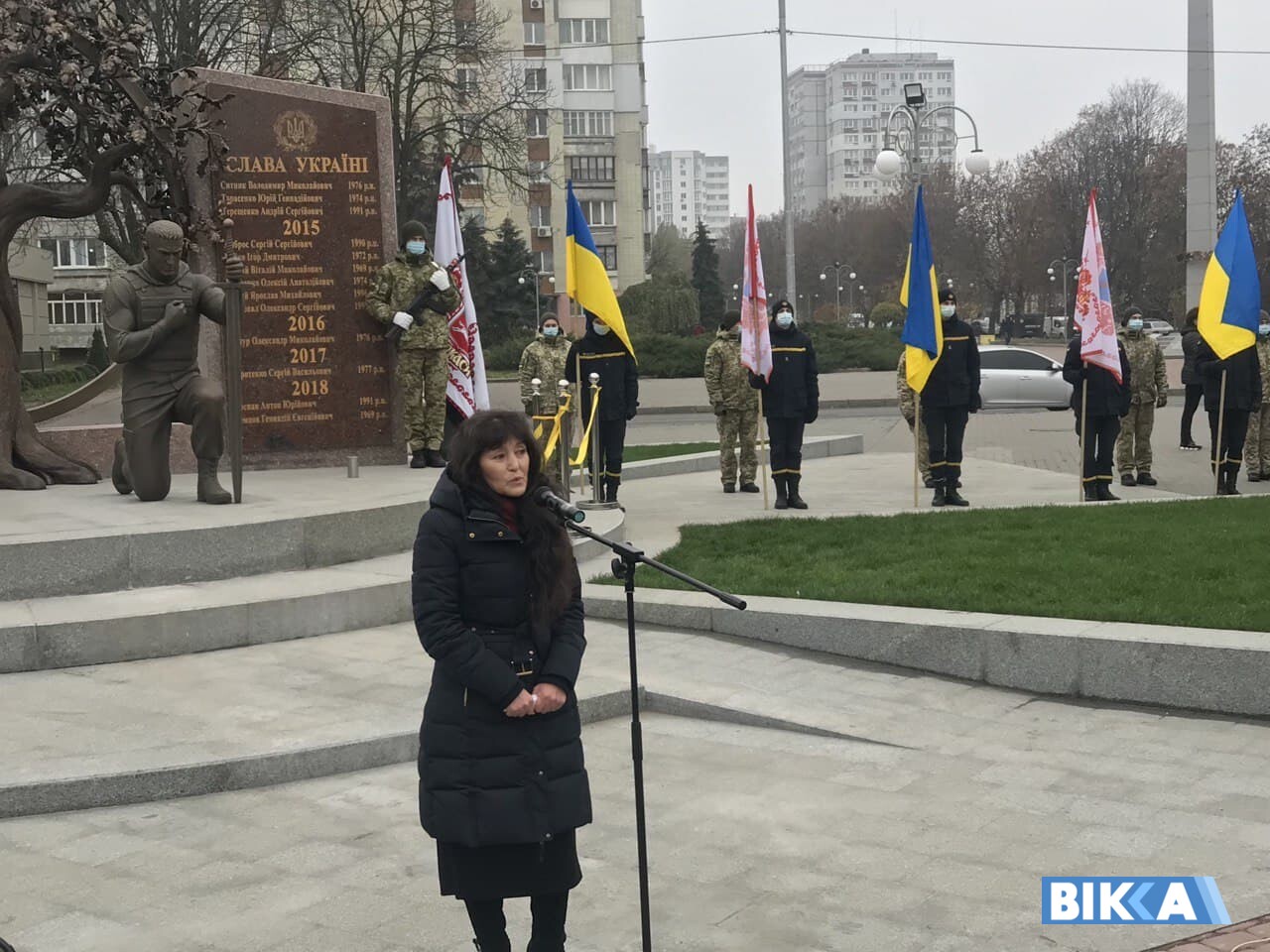 «Від концепції меморіалу до сьогодні, до втілення в життя, три роки минули як на одному диханні. Ми всім дуже дякуємо за те що, ідея воїна була прийнята. Що собою представляє меморіал для нашої сім’ї? Може, я висловлю спільну думку, якщо скажу, що це як відкритий світ. Це наша відповідь на питання усіх, хто досі не розуміє чи не хоче зрозуміти, чому вони пішли, що їх туди повело. Величезна любов… до людей, до своєї сім’ї, до самопожертви. Ще відповідальність… за наших дітей, онуків. Їх об’єднало те, що вони вважали, що мають право, величезне бажання, щоб усі ми були щасливими. І нагадування кожному, що ціна миру – це наше життя», – сказала дружина загиблого героя Олена Ложешнікова.
