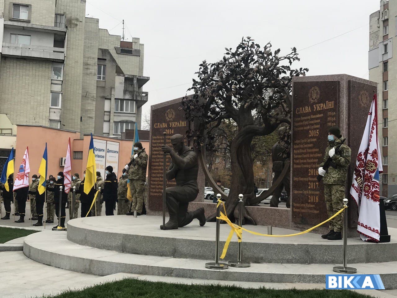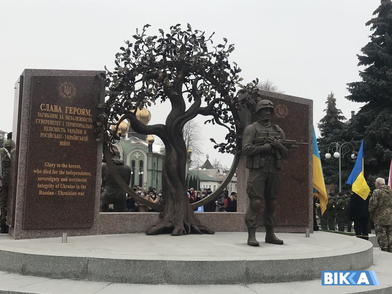 Поруч із «древом» дві стели червоного каменю. На їхніх зовнішніх сторонах викарбувані імена воїнів, які віддали своє життя за сучасну Україну.