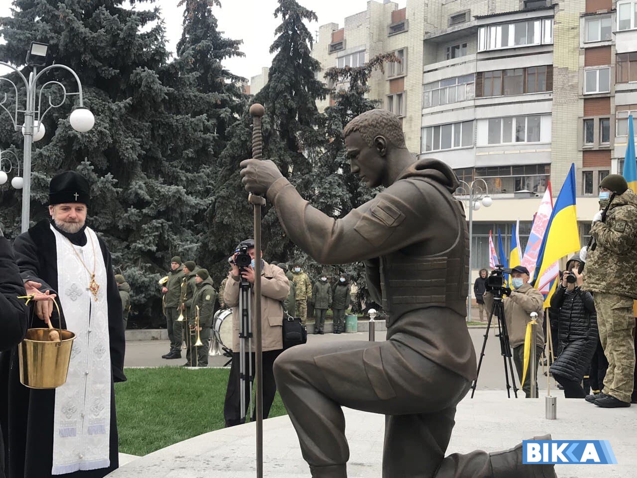 Із іншого боку дерева – ще одна скульптура «Воїна з мечем». Він, спираючись на меч, прихилив коліно. Він – ветеран, волонтер, медик, капелан, співробітник МНС, поліції, службовець, вчитель, студент, пенсіонер… Він – це народ, який підтримує своїх захисників.