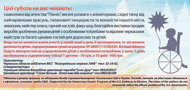 Захід спрямований на підтримку дітей з особливими потребами. Всі зібрані кошти під час проведення акції будуть направлені на підтримку ініціативи "Дитячий оздоровчий табір для дітей та молоді з інвалідністю".
