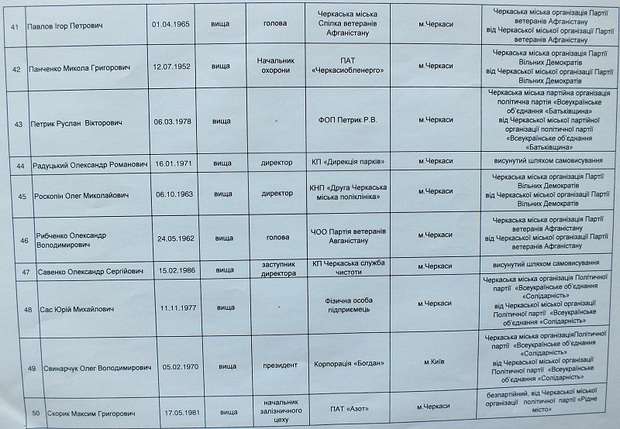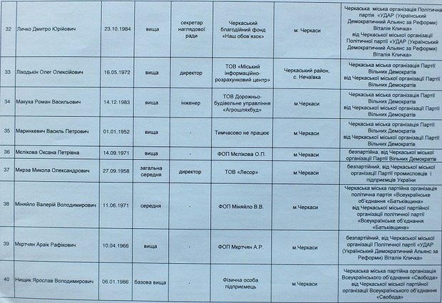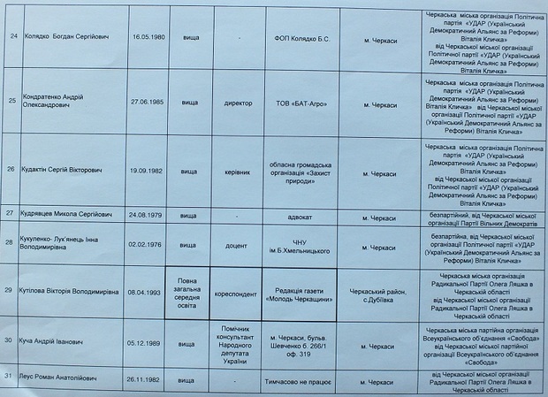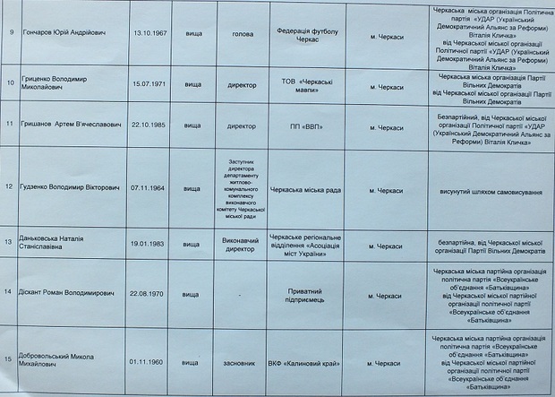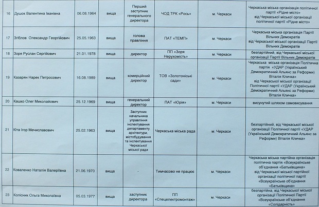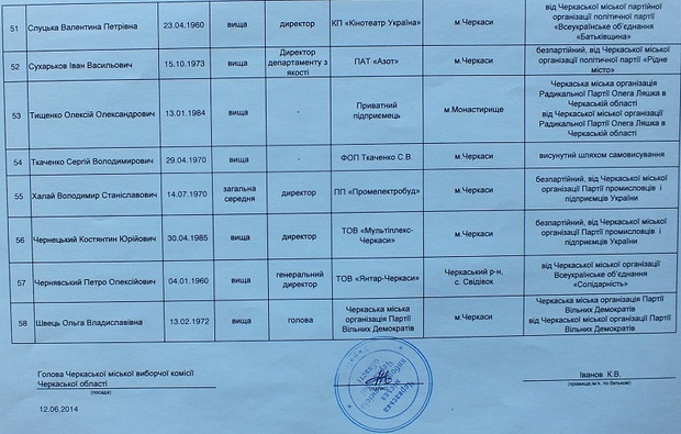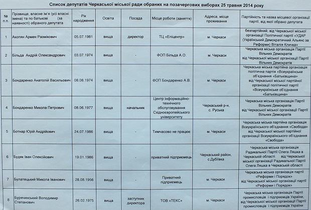 На сайті виконкому Черкаської міської ради з’явився перелік депутатів, які пройшли до міськради на позачергових виборах 25 травня 2014 року. Такі списки надала міська виборча комісія Черкаської області: