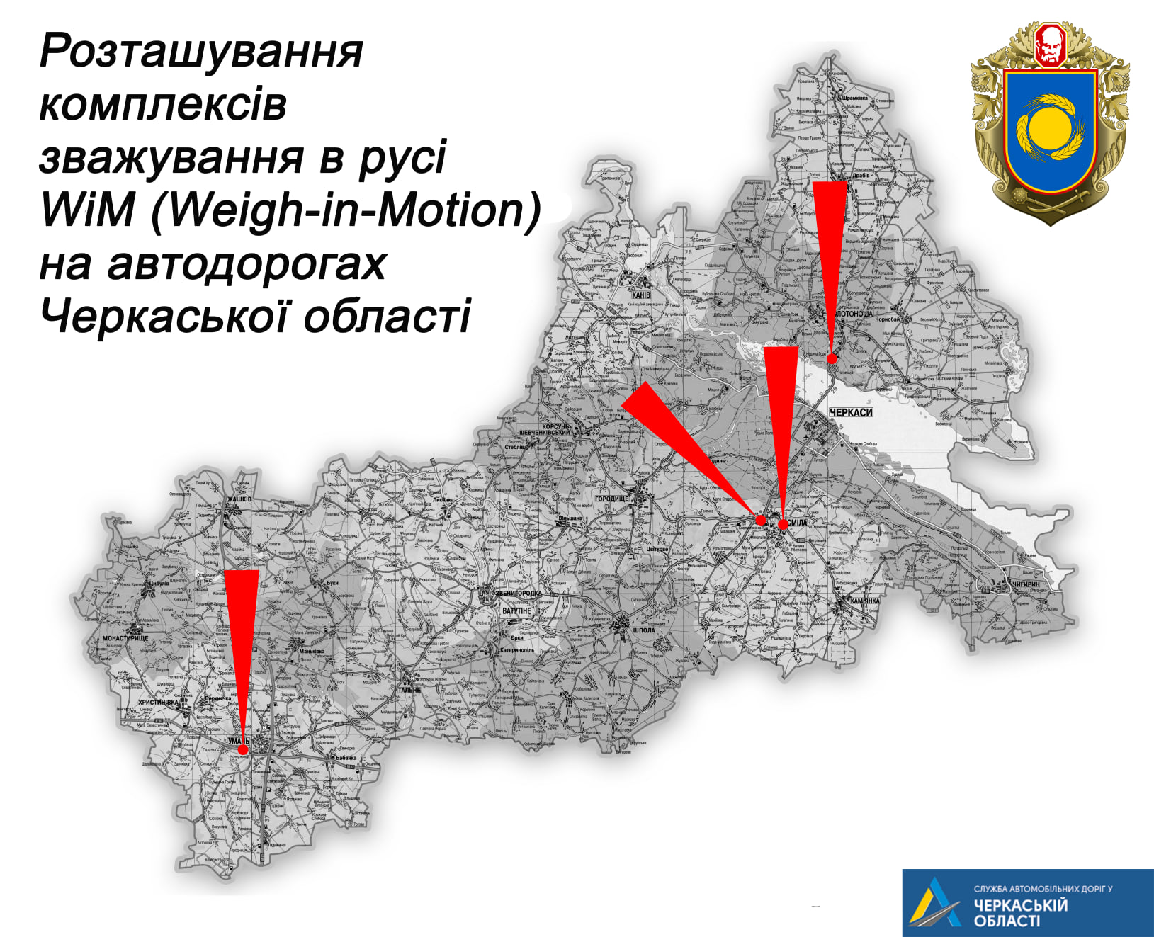 Загалом у Черкаській області до кінця 2020 року хочуть облаштувати чотири комплекси для зважування у русі WiM (Weigh-in-Motion) на автодорогах державного значення: автодорога Н-01 Київ – Знам’янка – на в’їздів місто Сміла зі сторони міста Городище та на виїзді з міста Сміла в напрямку міста Кам’янка, на автодорозі Н-16 Золотоноша – Черкаси – Сміла – Умань біля села Благодатного на в’їзді на дамбу через Дніпро та на автодорозі М-12 Стрий – Тернопіль – Кропивницький – Знам’янка поблизу міста Умань.