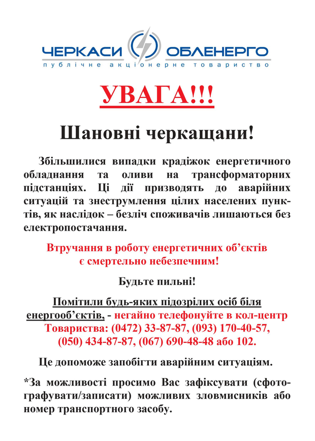 ПАТ "Черкасиобленерго" закликає споживачів бути пильними. Всі працівники Товариства мають стандартний спецодяг із логотипом підприємства та носять при собі посвідчення, яке вони зобов’язані пред’явити на вимогу споживача.
