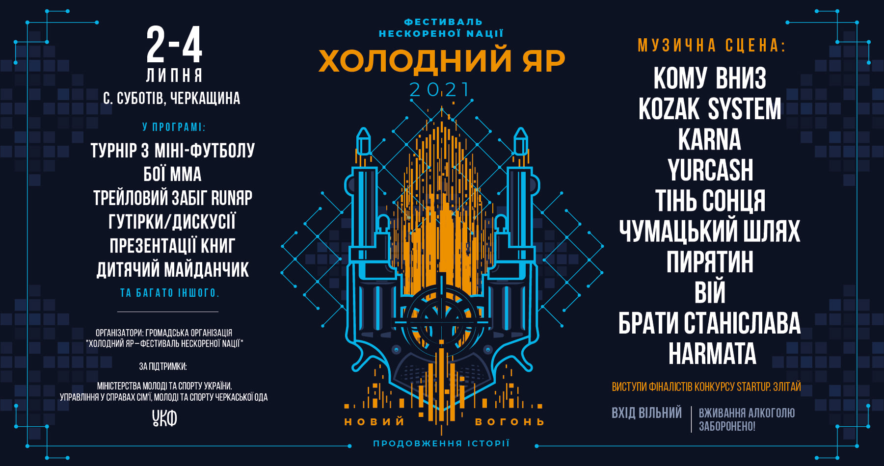 Хедлайнерами цьогорічного фестивалю Нескореної нації Холодний Яр 2021 стали гурти: «Кому вниз», «Kozak system», «Карна», «Тінь Сонця», «Юркеш». На сцені також виступлять «Вій», «Пирятин», «Чумацький шлях», «Брати Станіслава», «Hurmata» та 10 фіналістів конкурсу «Злітай».