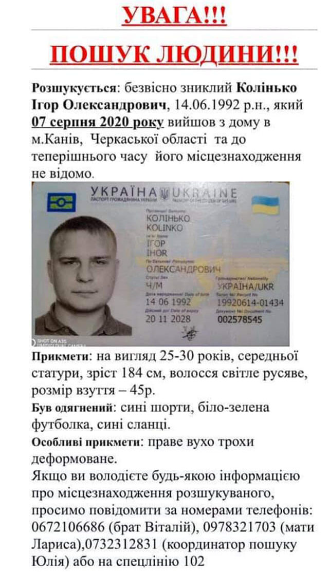 7 серпня 2020 року чоловік вийшов з дому у місті Канів і не повернувся. Про те, що пошуки і досі тривають, повідомив у Facebook брат зниклого Віталій Колінько.