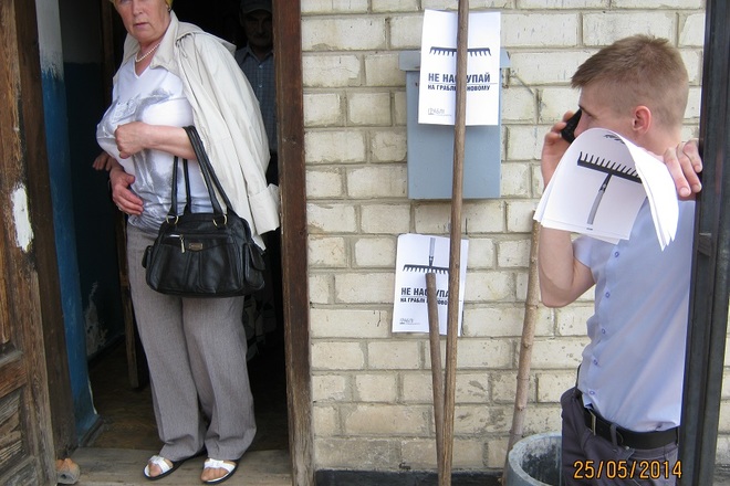 Активісти новоствореного і поки що маловідомого руху "Граблі" перед дільницями проводять флеш-моб "Не наступай на граблі по-новому".