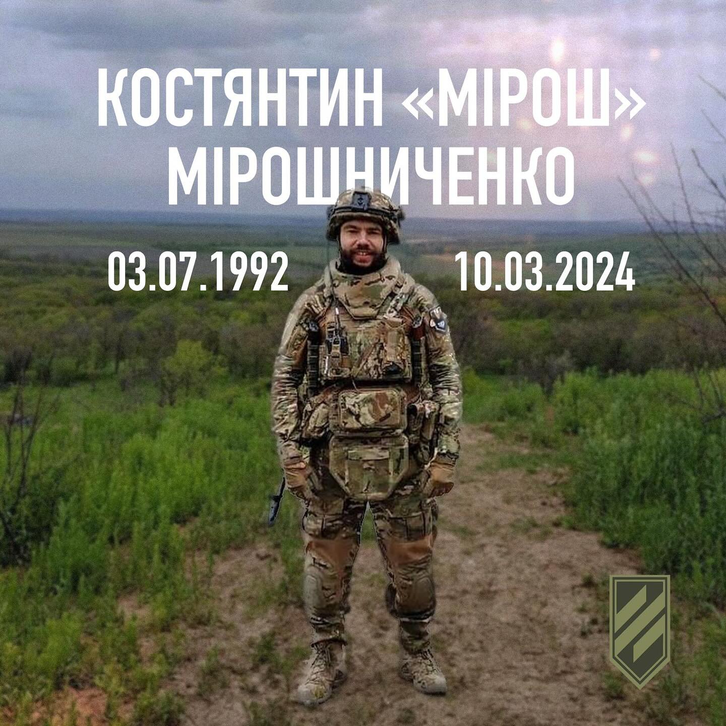 На війні загинув черкащанин Костянтин Мірошниченко (Мірош). Про це повідомив Дмитро Кухарчук, командир Другого штурмового батальйону 3-ої штурмової бригади.