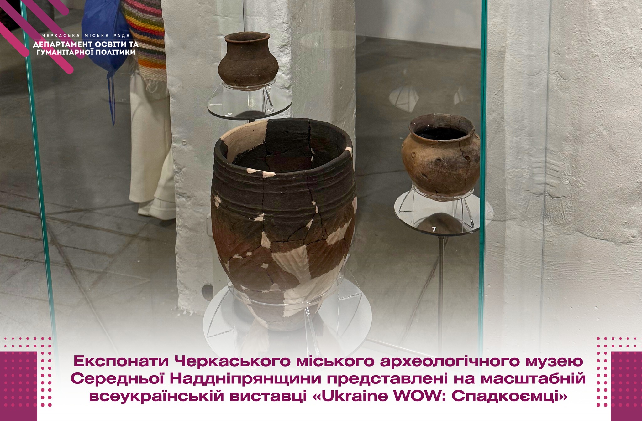Експонати Черкаського міського археологічного музею Середньої Наддніпрянщини стали частиною масштабного всеукраїнського виставкового проєкту «Ukraine WOW: Спадкоємці», який діє у Києві на базі АТ «Укрзалізниця». Інформує Департамент освіти та гуманітарної політики Черкаської міської ради.