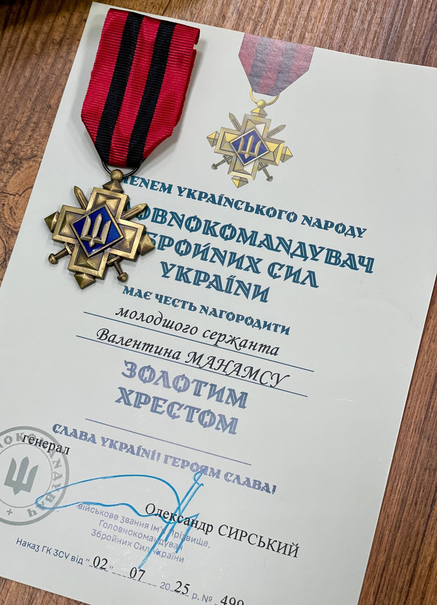 Сьогодні матері Захисника Валентина Манамси — Людмилі Тимофіївні — вручили почесну відзнаку Головнокомандувача Збройних Сил України «Золотий Хрест» — за мужність, стійкість і вірність військовій присязі. Повідомили на сторінці Золотоніської військової адміністрації.