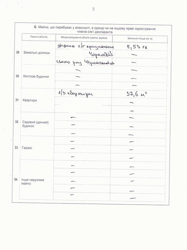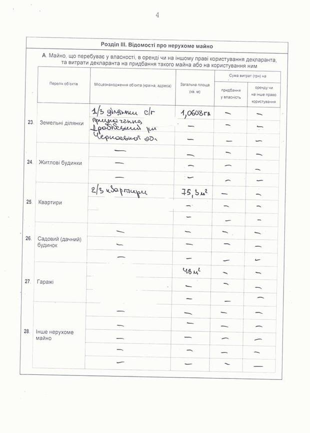 Також він має 1/3 земельної ділянки сільськогосподарського призначення у Драбівському районі, 2/3 квартири та гараж. Також частину квартири і земельну ділянку мають члени його сім'ї.