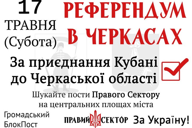 "Так як Кубань поки що окупована путінським режимом, Черкаси радо приймуть організацію референдуму у себе. "Правий Сектор" організовує на центральній вулиці міста блокпости, які слугуватимуть виборчою дільницею. Кожен вільний козак або симпатик матиме право голосу, право висловити свою думку.
